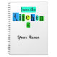 Ein individuelles Notizbuch mit Retrobriefen, die "From the Kitchen of" mit knackigen und niedlichen schwarzen Buchstaben mit blauen, grünen und aquamarinen Farbblöcken lesen. Passen Sie es an, um Schriftart, Hintergrundfarben und vieles mehr zu ändern und Ihr Design für später retten.