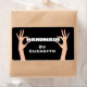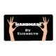Händchen, die das Wort "Handmade" mit individuelle Name halten. Die Hintergrundfarbe kann geändert werden.