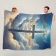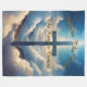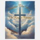 Blaues Kreuz zwischen flauschigen Wolken mit goldenem Typografie-Design.