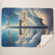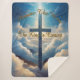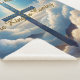 Blaues Kreuz zwischen flauschigen Wolken mit goldenem Typografie-Design.