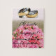 Puzzle des Vorschlags von Ehe, mit dem Text „Sie heiraten mit mir dir! (wir werden glücklich Sein und werden Rebhühner essen…)“ mit Strauß der Rosen der rosa Farbe und der Allianzen aufgrund Ton Kuchen. Eine unvergessliche Überraschung!