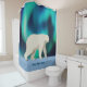 Ein niedlicher Eisbär (Ursus maritimus), in einem einfachen primitiven oder naiven Stil gemacht, geht auf dem Polareis spazieren, die Aurora Borealis (Northern Lights) leuchten hell im Hintergrund. Passen Sie Ihren eigenen Text an.