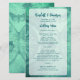 Budget Hochzeitsmenü Vorlage kostenlos mit Not leidendem grünes Papier. Dieses Layout hat einen Hintergrund aus Spritzer und Motte in aquamarinem Grün. Dunkelgrüner Text wird auf einem durchsichtigen weißen Feld mit Orten für Vornamen des Paares, Datum, Position, Menütitel und Liste der Menüpunkte gedruckt. Das Papier ist sehr erschwinglich, mit Rabatten für Großaufträge.
