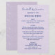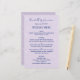 Lavender lila Hochzeitsmenü Vorlage. Hibiskus Blume Konturen bilden ein Lichtmuster über dem Hintergrund. Text ist dunkelmarinblau mit Namen des Paares oben mit Datum und Menütitel. Fügen Sie alle Menüpunkte in einem Absatz, wie Sie wählen. Die Beispielformulierung hat mit Großbuchstaben und Leerzeichen zwischen Abschnitten begonnen. Die Rückseite des Papiers ist dunkler lila mit dem gleichen Blumenmuster.
