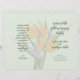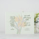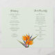 Gefaltete Hochzeitsvorlage mit orangefarbenen Paradiesvogel-Blume. Helles grünes Papier mit vier Seiten, um sich im Skript anzupassen und dunkelgrünen Text gedruckt. Fügen Sie eine Nachricht an Familie und Freunde auf der letzten Seite / Rückseite des Programms, wenn gefaltet.