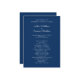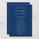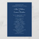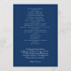 Schlichte, marineblaue Hochzeitsvorlage mit weißem Text auf beiden Seiten von Flachkarten. Das Design der 12x18 passt auf ein paar andere Größen. Diese Karten verfügen auch über optionale Papieraktualisierungen. Drucktext und handgeschriebene Skript-Schriftart lassen sich mit den Vorlagenabschnitten leicht anpassen. Ein dünnes Set von Zeilen macht einen Rahmen um den Kartenrand, um den Text zu rahmen. Passen Sie den Programmtitel an, geben Sie Datum und Uhrzeit der Veranstaltung, die Reihenfolge der Zeremonie ein und nennen Sie die Hochzeitsfeier. Eine Vorlage auf der Rückseite kann von dem Paar benutzt werden, um eine persönliche Nachricht an Gäste zu schreiben. Oder nutzen Sie den Raum, um Verwandte zu erwähnen, die nicht mehr leben, sondern im Herzen präsent sind. Dieses einfache Programm, das für viele Arten von Heiratzeremonien funktioniert.