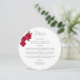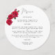 Runde Hochzeitsmenü Vorlage mit rote Rosen Design. Schwarzer Text auf weißen Karten, mit einfacher Formulierung an zwei Stellen hinzugefügt. "Menü" oben für den Titel, mit einem Absatz für alle Empfang Lebensmittel Auswahl. Entfernen oder fügen Sie gegebenenfalls Leerzeichen hinzu. Drei rote Rosen mit Knospen schmücken die obere links Seitenkante. Dieser Stil hat einen Durchmesser von 5,25 cm und ist auch quadratisch. Dieses Design kann auch als Sofortdownload erworben werden.