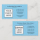 Zweiseitig anpassbare, hellblaue Baby Blue Visitenkarten: die Vorderseite mit Ihrem Foto und Informationen, die Rückseite mit dem Firmenlogo und den Informationen. Saubere, einfache Vorlage, geeignet für Unternehmen, Unternehmen und Organisationen, groß oder klein. Horizontale, beidseitig anpassbare Visitenkarten: die Vorderseite mit einem quadratischen Foto und Ihre Informationen, die Rückseite mit dem quadratischen oder runden Firmenlogo und Unternehmensinformationen. Saubere, einfache Vorlage, geeignet für Unternehmen, Organisationen oder Unternehmen, groß oder klein. Passen Sie diese Vorlage mit einem quadratischen Foto, Ihrem Namen, Titel, Telefonnummern, E-Mail-Adresse und Social Media an. Für zusätzliche Informationen oder Anweisungen ist Platz enthalten. Aktualisieren Sie die Vorlage auf der Rückseite mit einem quadratischen oder runden Logo, dem Firmennamen, dem Slogan oder der Tagline, der Adresse, Telefonnummern, E-Mail-Adresse, sozialen Medien und weiteren Informationen, die Sie einschließen möchten. Ideal für Mitarbeiter, Vertriebsmitarbeiter, Verkäufer und andere Mitarbeiter. Andere Formate und Farben für Visitenkarten sind verfügbar.