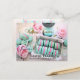 Macarons Rezept Postkarte mit einem hübschen Bild von bunten Makaronen mit rosa Rosen. Sie können den vergoldeten Happy Oaster Text löschen, wenn Sie ihn nicht benötigen, und Ihr eigenes Rezept auf der Rückseite hinzufügen.