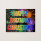 This fun, lively, birthday-themed jigsaw puzzle design has the message "HAPPY BIRTHDAY, CHRISTINA" having a colorful rainbow spectrum inspirred gradient pattern, and an exciting bursting celebratory fireworks inspirred background pattern. In Colorful Puzzle like this might be used to send a birthday greeting message to somebody named Christina. [~ Z0000465]