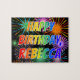 Dieses lebendige und aufregende Jigsaw Puzzle Design hat die Botschaft "HAPPY BIRTHDAY, REBECCA" mit einem farbenfrohen Regenbogenspektrum inspirierten Farbverlaufsmuster und einem pulsierenden, aufregenden, feierlichen Feuerwerk inspiriert Hintergrundmuster. Ein lebendiges Rätsel wie dieses könnte eine lustige Art sein, Geburtstagsgrüße an jemanden namens Rebecca zu schicken. [~Z0000465]
