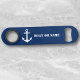 Votre nom personnalisé ou nom de bateau avec une Ancre nautique personnalisée en blanc sur une ouverture de bouteille longue couleur bleu marine.