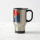 Le Travel Mug a un design abstrait dans les couleurs crème, rouge, bleu et un design numérique bronzé avec rayons. Vous pouvez changer les mots sur la tasse.