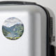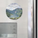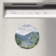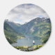 Rond souvenir frigo aimant du célèbre fjord Geirangerfjord, un bateau de croisière et le village de Geiranger entre les montagnes de Norvège.