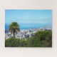 Puzzle. Une vue panoramique sur Honolulu Hawaii est présentée avec des immeubles hauts regroupés près du rivage. Un seul palmier trône au premier plan, au sommet d'une colline verdoyante surplombant la zone urbaine et l'océan bleu qui s'étend au-delà.