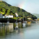 Après une journée de pluie, le soleil sort enfin et un arc-en-ciel apparaît dans le ciel, dans ce magnifique paysage du port d'Aberdyfi au Pays de Galles, avec des bateaux dans l'eau et quelques maisons du village.