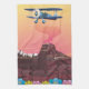 Ein Vintages blaues Propellerflugzeug, das tief über einem Vulkan fliegt.