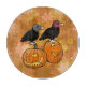 A pair of North American vultures, the Turkey Vulture and the Black Vulture, perch upon a pair of spooky carved pumpkins, aka jack'o-lanterns. Get ready for the spooky season with TUVU and BLVU!