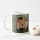 Ein wachsamer Löwe hebt seinen Kopf an und wird gerissen, während er unter grüne Gräser stützt.