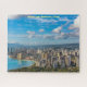 Der schöne Ausblick vom Diamond Head Kratersichtpunkt. Waikiki und Honolulu Wolkenkratzer entlang der Küste und mit pufffarbenem, weißem Himmel bedeckt.