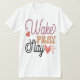 This fun, motivational, and faith-based apparel design features the popular phrase, "WAKE PRAY SLAY." The phrase encourages a daily cycle of waking with purpose, seeking spiritual guidance, and confidently conquering daily tasks. The text is rendered in a mix of playful, modern, and stylized fonts using multi-colored typography, including deep magenta, soft pink, and warm beige, creating a cheerful, feminine, and high-impact look on a clean white T-shirt background. Decorative elements include two hearts and a stylized cross, symbolizing divine love and victory. This versatile T-shirt design is a perfect way to express faith, confidence, and positive ambition. It is ideal for casual wear, fitness routines, church events, or as a thoughtful, empowering gift for women who embrace their spiritual and professional strength.