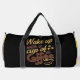 This black and coffee bean color duffle bag features a warm and inviting graphic with the text "Wake up with a cup of Coffee". A steaming coffee cup and scattered beans complete the design, celebrating the beloved morning ritual. Perfect for coffee enthusiasts, early birds, or anyone who cherishes their daily dose of caffeine. Edit color of the bag caps and body in the Design tool to your favored colors.