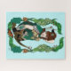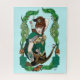 Ein rot haariger Elf, der einen Bogen und einen Pfeil hält, ist mit grünen Blätter in einer blauen Umgebung gerahmt
