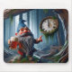 Ein glücklicher Gnome steht in einem Wald, der eine Tasse Bier hält und auf eine große rustikale Uhr zeigt, die inmitten der Bäume hängt, die fünf Uhr lesen.