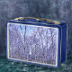 Dieses digitalisierte, grafische Foto eines kahlen, bewaldeten Waldes wird in gedämpften Farbtönen, violett, lila, blau, weiß, grau und schwarz dargestellt, in den anhaltenden Spuren, in einem blass-blauen, Dämmerlicht.