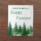 Glücklicher Camper Geburtstag mit Waldbäumen in verschiedenen Schattierungen grün