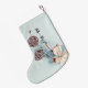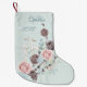 Weihnachtsstrumpf | Name und Datum hinzufügen - Weiße Hirsche und ein blühendes botanisches Winterspray aus Kiefernzapfen, rosa Rosen, Eukalyptus-Blätter und Winterzweigen - ein botanischer Blumenspray auf der Rückseite . auf sehr hellgrünem Hintergrund. Dies ist Teil der Watercolor Woodland Deer Collection von WhimsicalArtwork™