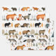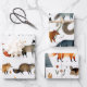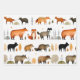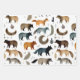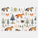 Stilisierte Waldkreaturen im Aquarellstil wie Füchse, Bären und Wölfe auf weißem Hintergrund, Sprinklen mit Blätter und Bäumen.