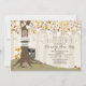 Eine Babydusche-Einladung, die eine Abbildung eines Fuchses, einer Eule und eines Raccoons zeigt, der um einen Baum stehend ist, der mit Bannern ummantelt ist und in dem steht: "Welcome Baby" Tree zeigt sichtbare Wurzeln, Herbstblätter und Pilze. Weiße Fülle über anpassbarem Text.