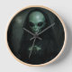 Dieses Kunstwerk zeigt eine weibliche Alien in einem exquisiten gotischen und mystischen Stil. Sie hat eine lang gestreckte Glatzkopf und große, dunkle, andere Augen, ihre Haut ist ein blasses Grün, das mit ihrem Kleid kontrastvoll kontrastiert. Sie trägt ein hochfarbiges, faszinierend gemustertes schwarzes Gewand mit würzigen Spitzwellen und einem korsetierten Körper, das Viktorianisch trauernde Mode hervorruft. Ein schlichter schwarzer Schleier zieht sich über ihren Kopf und die Schultern und verstärkt so ihre spektrale Präsenz. Rund um ihren Hals hängt ein auffallender Anhänger - ein großes Pentagramm, umgeben in einem Kreis, ruht über einer zarten Schnürung. Hinter ihr, unter dem unheimlichen Glühen eines Vollmonds, erheben sich die Silhouetten der gotischen Kathedrale-Türmchen, die die düstere, rituelle Atmosphäre vertiefen. Die Gesamtkomposition verbindet extraterrestriale Elemente mit okkulter Eleganz, was sie als königlich und verstörend erscheinen lässt, wie eine hohe Priesterin aus einer anderen Welt