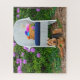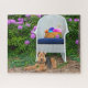 Niedlicher Welsh Terrier Hund im Rhododendren-Garten mit einem farbenfrohen Garn auf weißem Korbsessel.