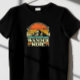 Hier finden Sie Ihr aktuelles Vintages T - Shirt-Design mit einer Retro-Bergwelt mit geschichteten Gipfeln, einem Sonnenuntergang und der Phrase "Wander More" 🏔️ 🌅 ✨.
