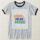 Dieses T - Shirt-Design enthält den Satz "Wander. Träume. Entdecken Sie." in einem handgezeichnet, mehrfarbigen Schriftart. Jedes Wort ist eine bestimmte Farbe - orange, blau und grün - und wird von einem kleinen grafischen Element begleitet, wie einem Kompass, einer Wolke und einem Stern. Das Design hat ein etwas Vintages Gefühl, ideal für alle, die Lieben zu reisen und zu erkunden.