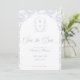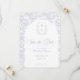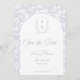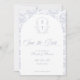Dusty Blue Monogram Wappen Wedding Save The Date: Vintag inspiriert Line Art Monogram Wappen mit eleganter staubblauer Typografie. Ein chinoiserie Blumenmuster in Form eines Bogens und auf der Rückseite für zeitlose Eleganz. Eleganter Script-Schriftart für einen formalen und klassischen Stil.
