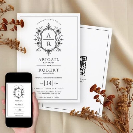 Elegante Schwarz-Weiß-Vintage, aber moderne blumengeschmückte Wappen-Monogramm Hochzeit RSVP Card mit QR-Code. Die elegante Hochzeitskarte RSVP zeichnet sich durch ein ausgeklügeltes Design aus, das Vintagen Charme mit modernem Komfort verbindet. Als Mittelpunkt dient ein wunderschön gefertigtes, schwarz-blumengeschmücktes Wappen, in dem die Initialen des Paares in einem raffinierten Monogramm dargestellt werden. Die zarten Blumendetails rufen ein Gefühl zeitloser Romantik hervor. Um den UAWG zu vereinfachen, wird auf der Kartenrückseite ein hervorgehobener QR-Code angezeigt, der es den Gästen ermöglicht, über ihre Smartphones schnell und einfach online UAWG zu machen. Diese durchdachte Ergänzung strafft die Antwortsammlung und fügt der Vintag inspiriert Ästhetik eine zeitgemäße Touch hinzu.