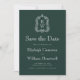 Diese Vintag-inspirierte Hochzeit Save the Date Design beinhaltet ein Paar weißer Monogramm-Initialen in einem offenen Serif-Schriftart über und unter einer Trennlinie und umgeben von einem Line Art Acanthus Wappen auf einem dunkelwaldgrünen Hintergrund. Die Rückseite der Karte ist massiv grün.
