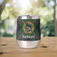 Abzeichen des Clan MacDonell of Glengarry umgeben von einem Gurt und Schnalle über einem Tartan-Hintergrund. Benutzerdefinierter Text auf beiden Seiten.