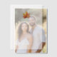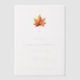 This elegant wedding invitation features a minimalist design with ample white space, creating a clean and sophisticated look. The centerpiece is an illustration of a warm-toned maple leaf in shades of red, yellow, and orange, adding a touch of autumnal charm. The text is arranged vertically using a classic serif font, conveying formality and tradition, while the muted earth tones complement the off-white background. Perfect for couples seeking a traditional yet understated aesthetic, this invitation sets the tone for a warm and celebratory occasion.