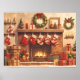 A heartwarming Christmas illustration showing a fireplace with hanging stockings, candles, wreaths and a decorated tree surrounded by gifts. The cozy glow and nostalgic color palette evoke a classic holiday feel.
