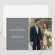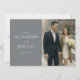 This wedding thank you card features a split design with a modern, elegant aesthetic. The left side showcases a solid gray background with clean, white sans-serif text, while the right side displays a soft-focused photograph of two individuals walking hand-in-hand in an urban setting, dressed formally and holding a bouquet. The color palette is muted, combining grays, whites, and natural tones for a sophisticated look. The overall mood is warm and celebratory, making it perfect for expressing gratitude after a special occasion.