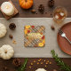 Dieser Erntedank Papier Untersetzer ist ein karierter, warmer und klassischer Hintergrund in Braun-, Bräunungs- und Cremetönen. Das Design ist gerahmt durch die typische Herbstpracht: lebendige Kürbisse in Aquarellfarben und eine prächtige Herbstblattstreuung in feinen Rottönen und brillanten Golden. Ein ausgeklügelter goldener Pinselstrich sitzt zentral und kann mit Ihrem Familiennamen personalisiert werden oder unter der "GLÜCKLICH DANKSGIVING"-Nachricht begrüßt werden. Freuen Sie sich auf zauberhafte Details wie Anissterne und rote Beeren, die dieses festliche, quadratische Design mit viel Textur ergänzen.