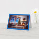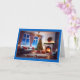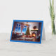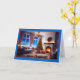 Die Vorderseite dieser Weihnachtskarte präsentiert eine gemütliche und elegante Wohnzimmerszene, das Set vor dem Hintergrund eines schneebedeckten Winterwunderlandes, das durch große Fenster zu sehen ist. Das helle Interieur besticht durch einen wunderschön dekorierten Weihnachtsbaum, der mit leuchtenden Lichtern geschmückt ist und von hübsch verpackten Geschenken umgeben ist. Ein Kranz mit einem knallroten Bogen hängt über einem Kamin, in dem ein warmes Feuer knistert, was das einladende Ambiente noch verstärkt. Das Zimmer ist geschmackvoll eingerichtet und mit sanften, gepflegten Möbeln ausgestattet. Dazu gehört auch ein bequemes Sofa mit festlichen roten Kissen. Der tiefblaue Abend und die schneebedeckten Bäume, die sich im Freien befinden, sorgen für Wärme und Komfort der Innenlandschaft. Die Grenze der Karte ist ein kühn blau, das Bild wird eingerahmt, und die Worte "Frohe Weihnachten" sind in einem eleganten schwarzen und roten Schrift unten geschrieben, was dem Design einen fröhlichen Gruß verleiht. Diese Karte spiegelt den friedlichen und fröhlichen Weihnachtsgeist perfekt wider und eignet sich somit ideal, um Freunden und Familie einen angenehmen Aufenthalt zu ermöglichen. Es ist ideal für diejenigen, die klassische und heimelige Urlaubsbilder schätzen.