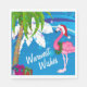 Dieses gemütliche Ambiente aus der Ferienserviette empfängt Sie mit Palmen, die mit Weihnachtsbeleuchtung geschmückt sind, und einem Flamingo mit einem Set aus der Weihnachtsmannmütze, das vor einem coolen, blau-weiß abstrakten Strandhintergrund steht. Einige Grafiken von artwork&@delightful-doodles.com *