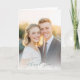 Diese Hochzeits-Dankeskarte zeigt ein warmes, romantisches Foto von zwei Personen in einer intimen Pose, vor einem sanft verschwommenen Hintergrund mit goldenen Farbtönen und Pastellfarben. Das Design umfasst eine elegante Typografie mit klassischen Serifenschriften für die Namen und das Datum, ergänzt durch ein kursives "Danke", das eine persönliche Note hinzufügt. Das Gesamtlayout ist sauber und ausgewogen, betont Einfachheit und Wärme und ist somit perfekt, um Dankbarkeit nach einer freudigen Feier auszudrücken. Die Stimmung, die hervorgerufen wird, ist eine von Zuneigung und Glück und ideal, um lieben Menschen herzlichen Dank auszusprechen.