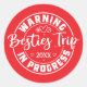 Dieser lustige Rundaufkleber enthält den fetten Text "Warnung: Besties Trip in Progress" mit einem anpassbaren Jahr. Die Farbe und das Jahr des Designs können in jede beliebige Farbe geändert werden, sodass Sie sie mit Ihrer bevorzugten Hintergrundfarbe abstimmen können. Ideal für die Dekoration von Gepäck, Reisezeitschriften, Gastgeschenke oder Geschenken für Ihren persönlichen Aufenthalt. Ein toller Vorzug für Junggeselinnen-Abschiede, Mädchenausflüge oder ein unvergessliches Erlebnis mit Freunden!