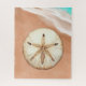Rätsel in einem detaillierten Sand Dollar ruhen auf weichem Sand und sanfte Wellen hinein. Die Aquarelltextur verleiht ihm ein ruhiges und ungestörtes Ambiente, und die natürlichen Farbtöne behielt es einfach, aber elegant.